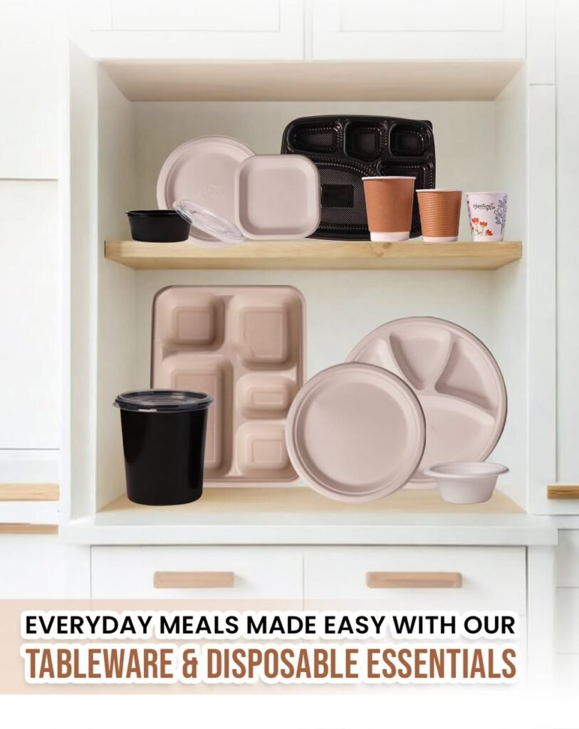 Our range includes meal trays, hinged containers, plates, bowls, paper glasses, cups, lids and pulp‑based disposables for food and beverages.